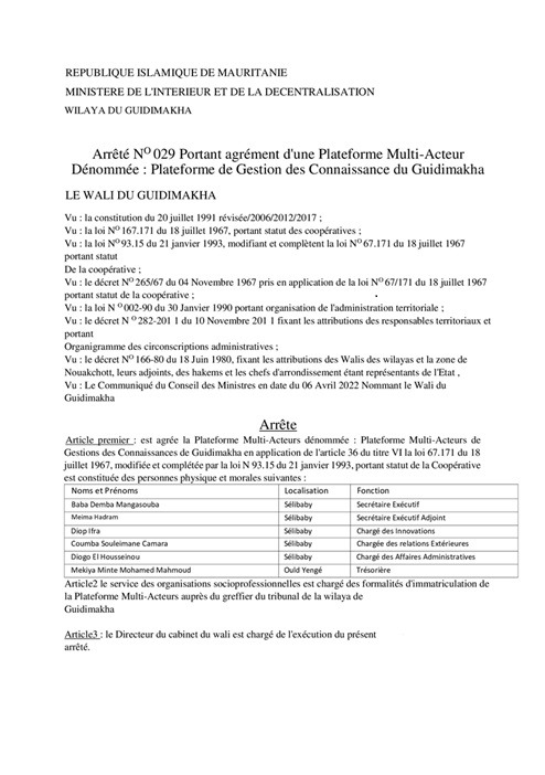 C’est le cas de l’arrêté N° 029 du 23 octobre 2023 portant agrément d’une Plateforme Multi-acteur dénommée Plateforme de gestion des connaissances du Guidimagha. Il s’agit de la composante C, la troisième du projet